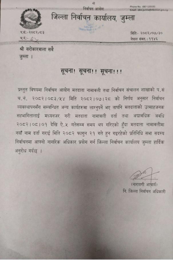 मतदाता नामावली तथा अद्यायवधि अवधि थप सम्बन्धमा ।